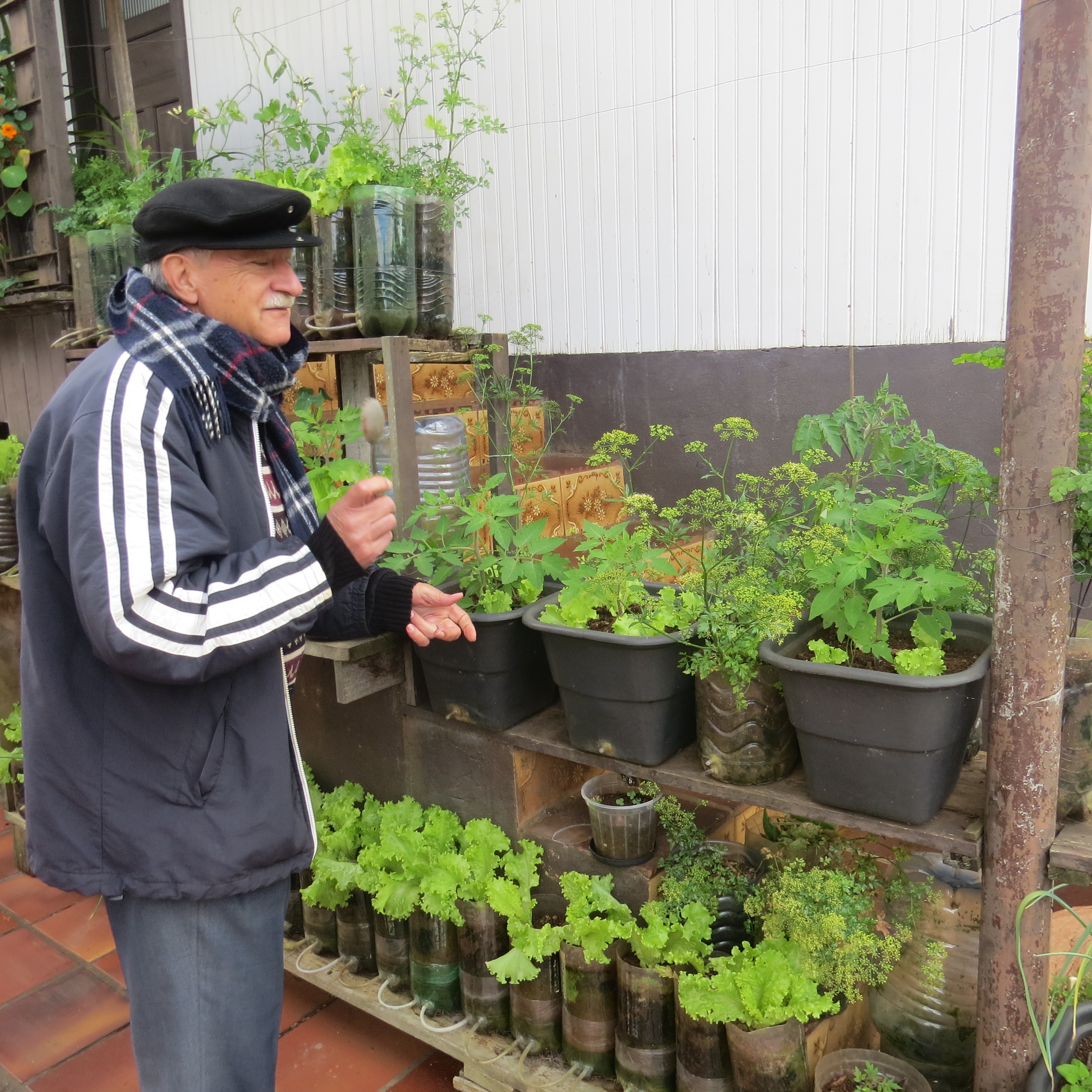 O mentor da ideia é o aposentado Henrique Augusto Peter, que há pouco mais de sete anos cultiva alface, radici, algumas variedades de tomate, salsinha, cebola, cebolinha, cenoura, beterraba, pimentão, repolho e alho-poró na área de lazer em frente a casa em que mora. Todo alimento produzido não leva qualquer tipo de componente químico nem fertilizante. A terra usada é adubada através do processo de compostagem, que ele mesmo prepara. De acordo com ele, desde o início dos ensaios os resultados foram além das expectativas. “É possível cultivar qualquer espécie de legumes, como milho, tomate, ervilha, feijão de vagem, beterraba, repolho, couve, morangos. Todas as espécies de condimentos, inclusive bonsai.”